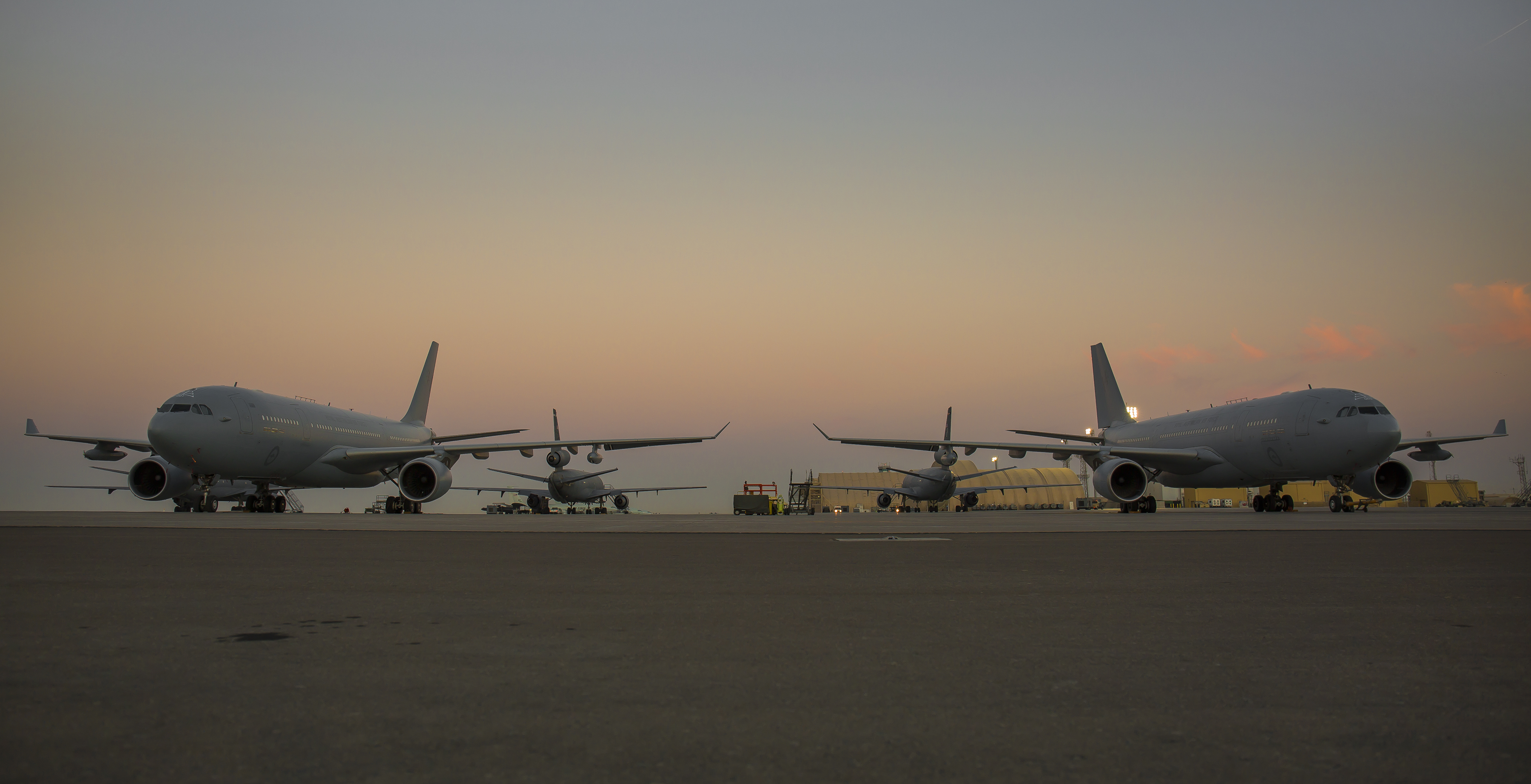Two KC-30A Multi Role Tanker Transport aircraft sit together at the main air operating base in the Middle East Region on Operation OKRA. (Source: ADF)