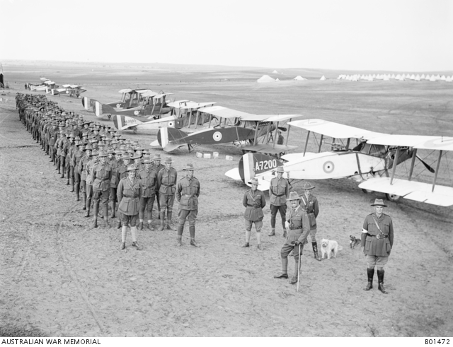 No. 1 Squadron, Australian Flying Corps next to their Bristol FB1 fighters, at Mejdel. The officer in the foreground (with stick) is Lieutenant-Colonel R. Williams, D.S.O., commanding. (Source: Australian War Memorial)